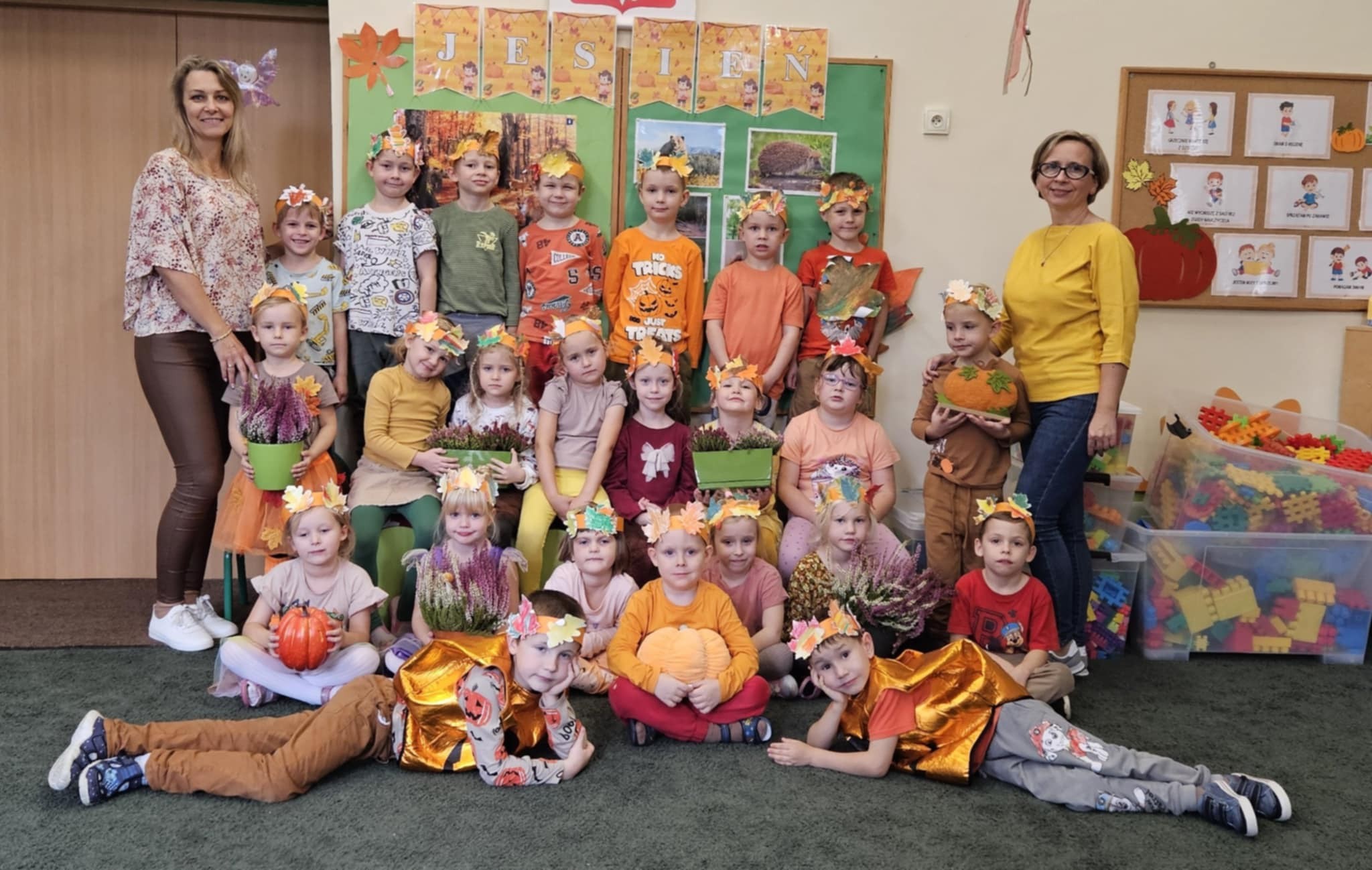 Tegoroczna jesień również upłynęła naszym przedszkolakom niezwykle wesoło. Kolorowe jesienne przebrania, tańce, zajęcia i mnóstwo uśmiechów było słychać przez cały październik.