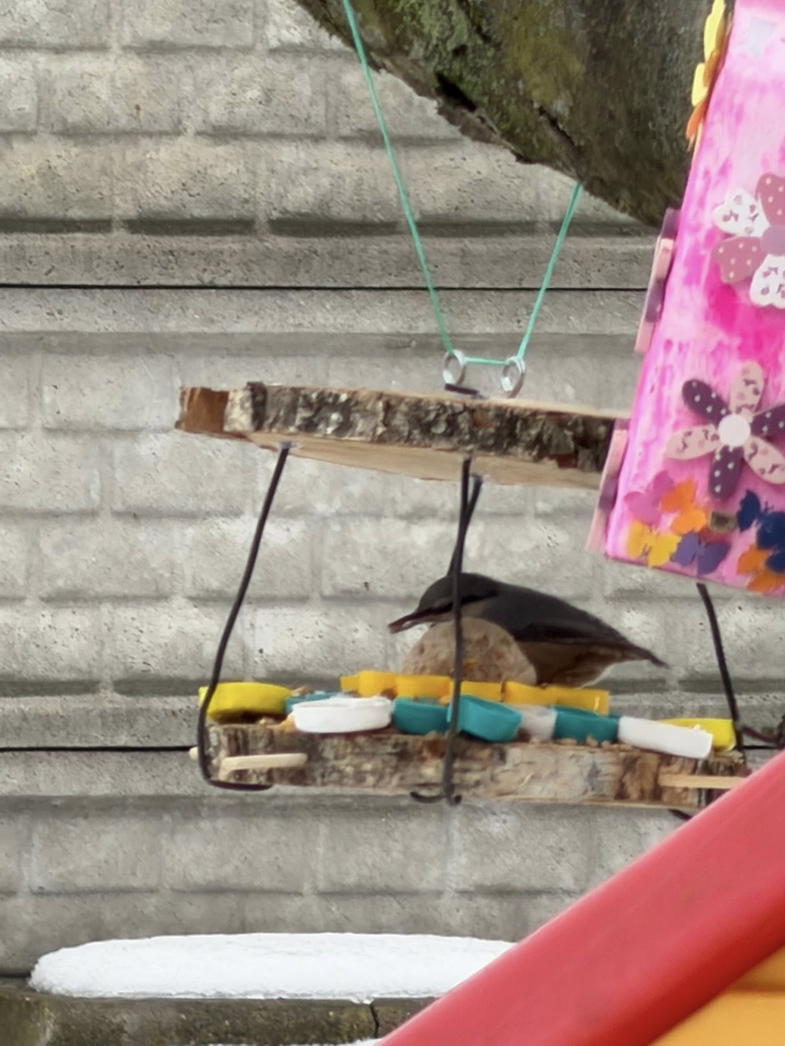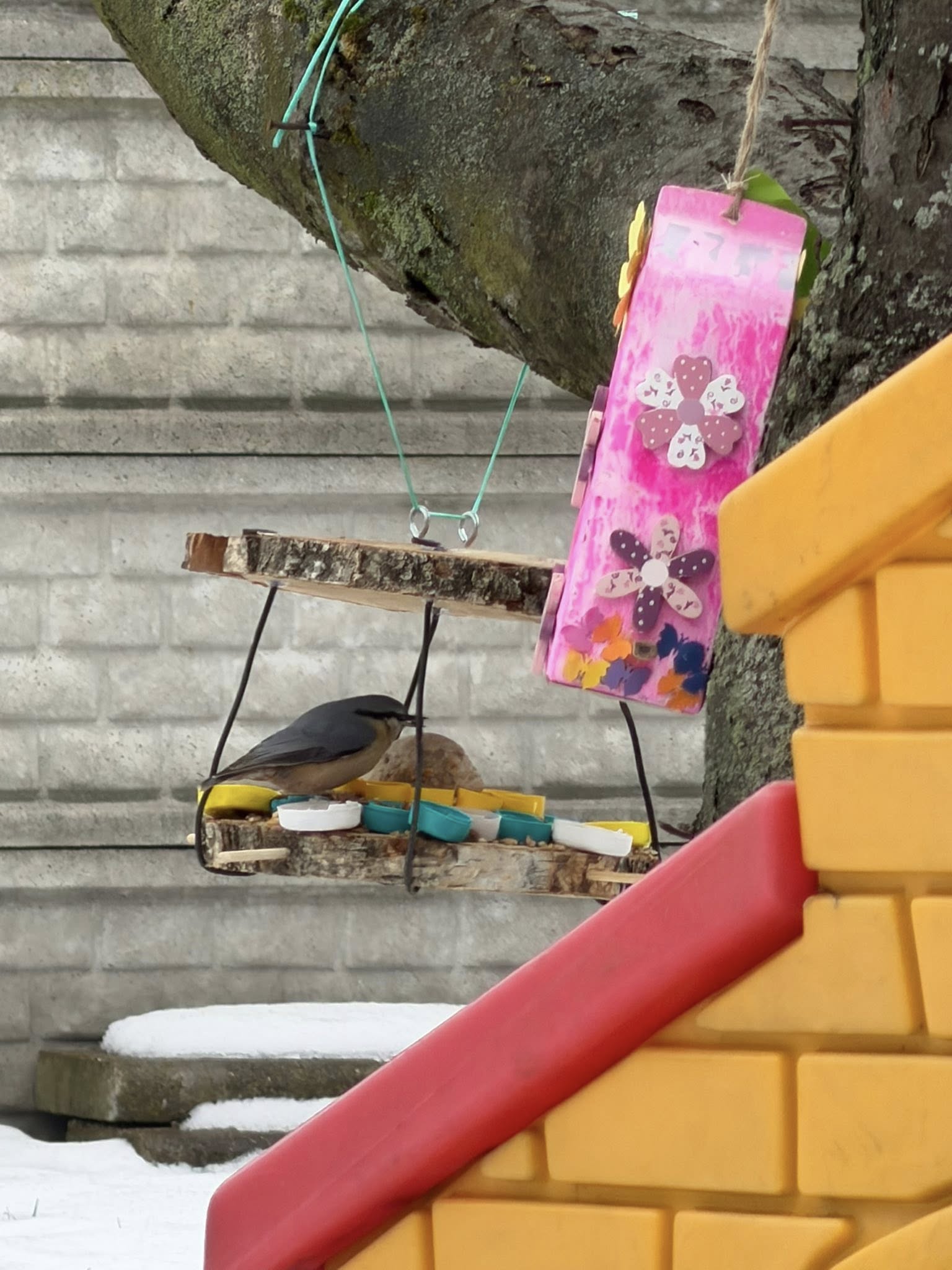 Odkąd w naszym przedszkolnym ogrodzie pojawiło się kilkanaście karmników, stale je uzupełniamy pokarmem przyniesionym przez dzieci i ich rodziców.