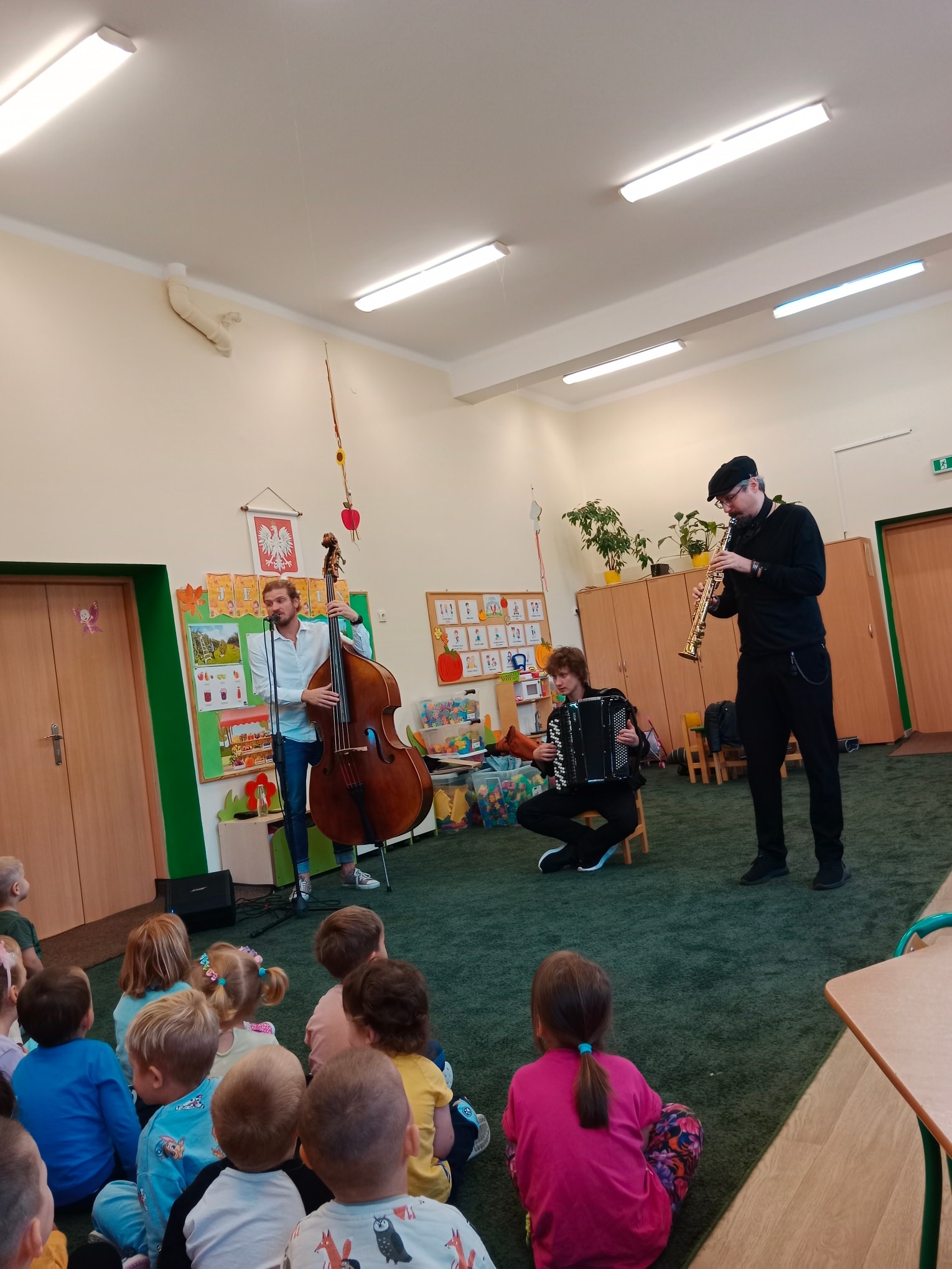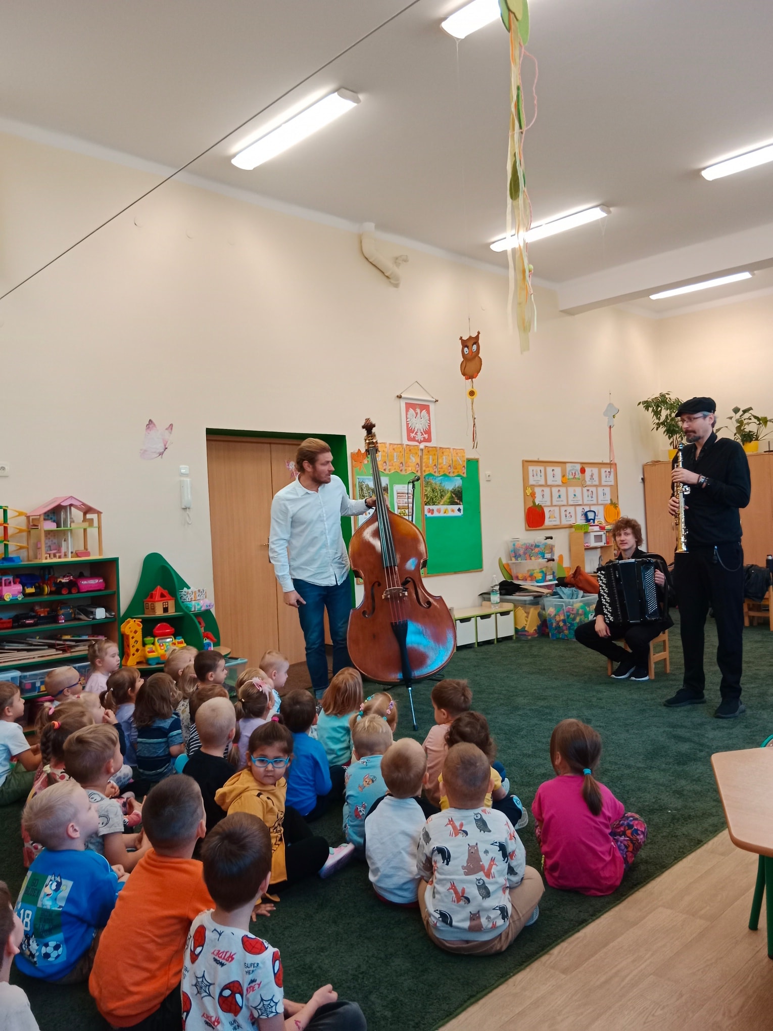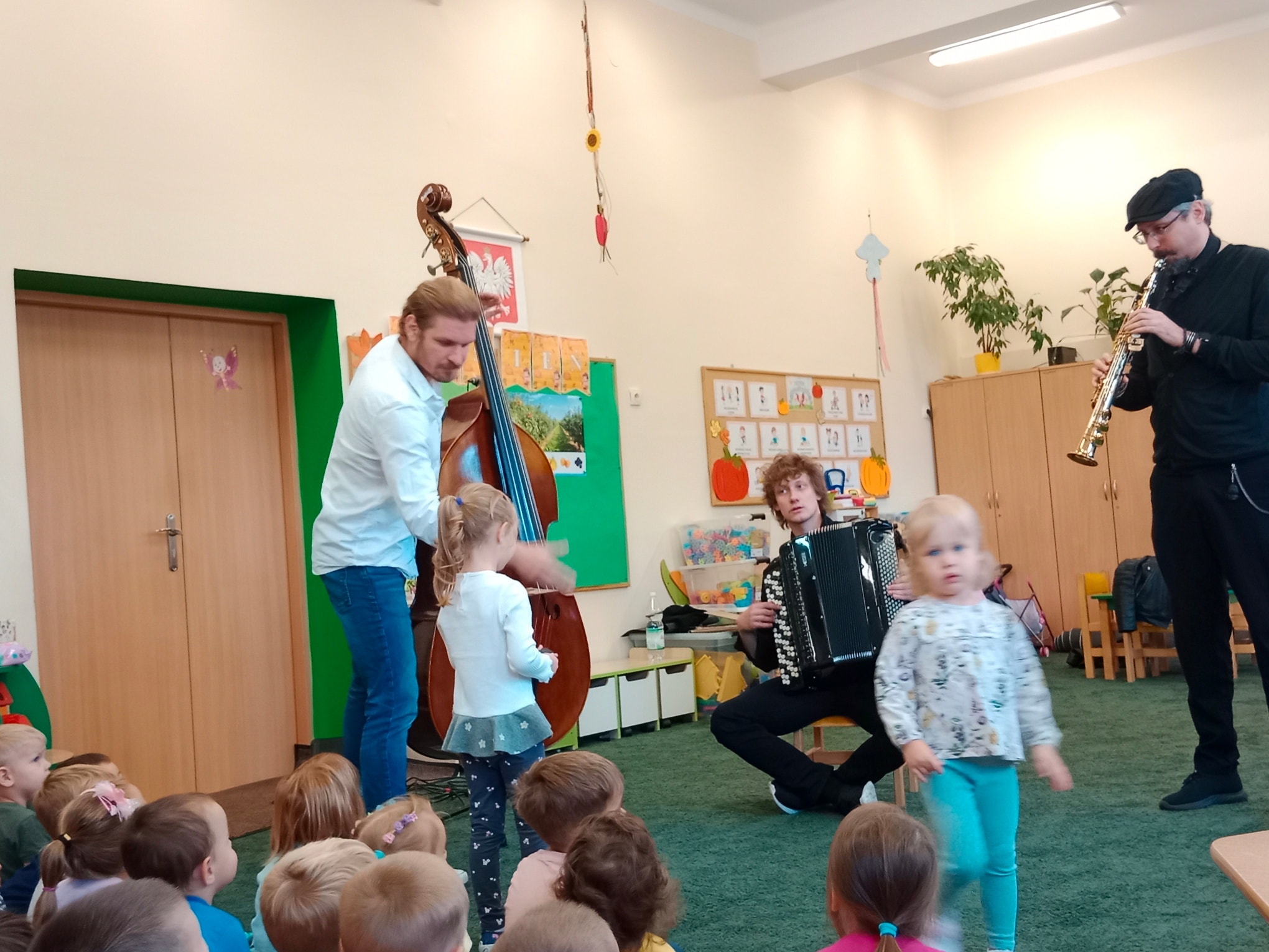 Podczas koncertu muzycznego pt. "Zwariowane melodie" dzieci śpiewały, ilustrowały muzykę ruchem oraz poznały instrumenty takie jak kontrabas, akordeon i saksofon.